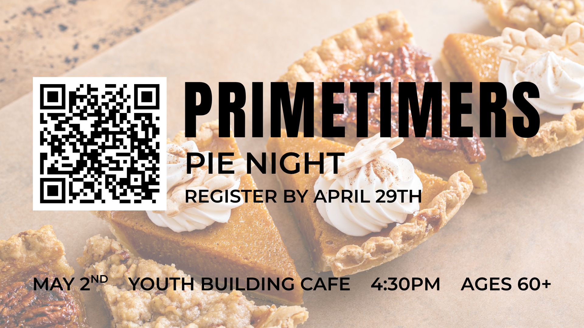 Back to All Events Primetimers Pie Night Saturday, May 2, 2026 4:30 PM 7:30 PM Google Calendar ICS PRIMETIMERS 60+, join us on May 2nd, in the Youth Building for Pie Night! Bring a pie (meat pie, dessert pie, or a pizza pie). Drinks will be provided! Please sign up online or at the Connect Center by April 29th. We hope to see you there! REGISTER NOW